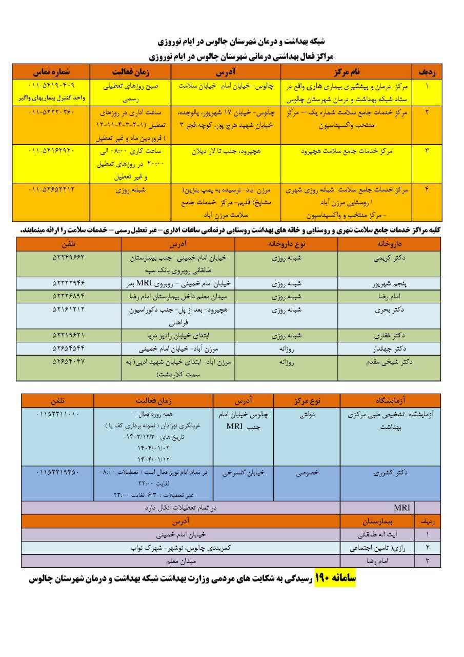 جدول مراکز فعال بهداشتی درمانی شهرستان چالوس در ایام نوروز ۱۴۰۴