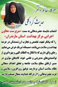 سرکار خانم دکتر حدیث گردکلی انتصاب شایسته حضرتعالی به سمت « سرپرست معاون اجرایی مرکز بهداشت استان مازندران » را که بیانگر تعهد، تخصص و تجارب ارزشمندتان در عرصه بهداشت و سلامت میباشد، صمیمانه تبریک عرض مینمایم. رجای واثق داریم که با اتکال به الطاف الهی و بهرهگیری از توانمندیهای مدیریتی و علمی خود، گامهای مؤثری در مسیر ارتقای سطح سلامت جامعه و تحقق اهداف متعالی نظام سلامت استان بردارید. توفیق روزافزون، سلامتی و عزت حضرتعالی را از درگاه خداوند متعال مسئلت داریم.
