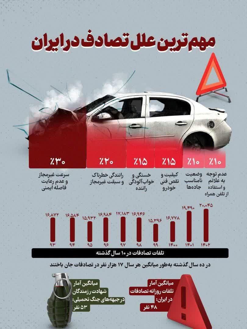 طبق آمار اعلام شده : بیش از ۷۵ درصد علل تصادفات مربوط به عامل انسانی است. 🔻در کشور جنگ نیست ولی در بحث سوانح رانندگی متاسفانه معادل جنگ داریم کشته می دهیم.