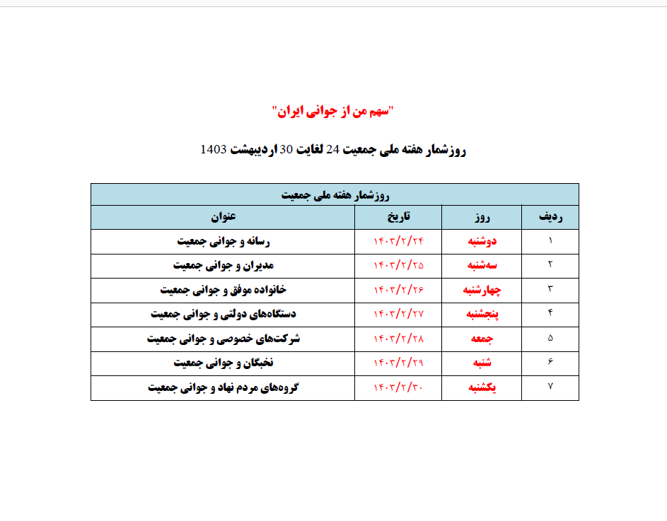 روز شمار هفته ملی جوانی جمعیت